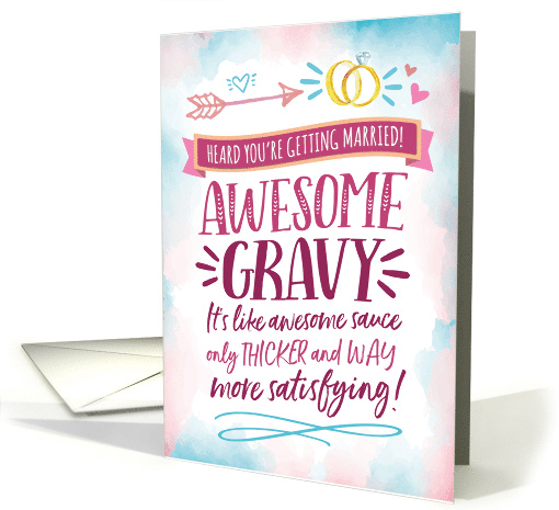 Congratulate someone on their wedding with this modern hand-lettering style typography style card with banner at top which reads, "Heard you're getting married!" The message continues with the words, "Awesome Gravy! (It's like awesome sauce only thicker and WAY more satisfying!" Design is accented with cute design ornaments, banners, hearts, arrow and sparkling wedding and engagement rings. Inside can customized to fit your needs.
