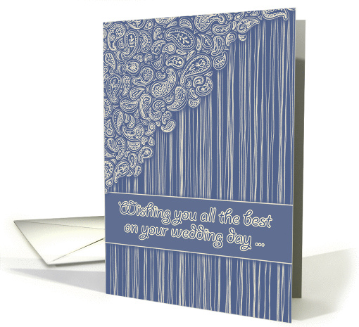 Hand drawn cream paisley lace doodles against a grey blue background, with hand drawn stripes, decorate this wedding day card. Text reads: Wishing you all the best on your wedding day ... Perfect to accompany your gift for the happy couple on their special day!