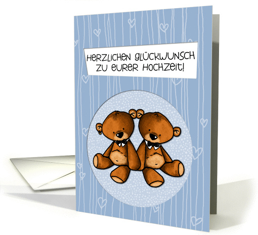 | Artist Notes: | A gay couple represented by two cute teddy bear grooms wearing a bow tie and white collar on a light blue background with lines and hearts pattern with the text "Herzlichen Glückwunsch zu Eurer Hochzeit!" = "Congratulations on tying the knot" in German |