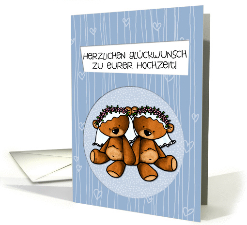 | Artist Notes: | A lesbian couple represented by two sweet teddy bear brides wearing a veil on a light blue background with lines and hearts pattern with the text "Herzlichen Glückwunsch zu eurer Hochzeit!" = "Congratulations on tying the knot" in German |