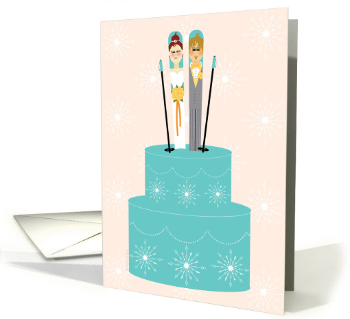 | Artist Notes: | A whimsical bride and groom as skis, pose on the top of a bright aqua colored wedding cake decorated with snowflakes. A fun card for the couple who loves to ski, or for anyone having a winter wedding. The background of this card also features snowflakes over a pale peach color. |