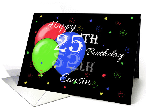 A birthday card for a cousin's 25th birthday with a black background, a blue, red and green balloon and scattered swirls and stars.