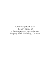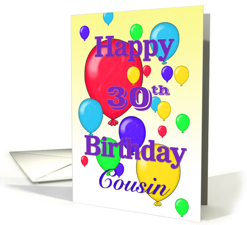 A colorful, fun 30th birthday card for Cousin with red, blue, yellow and green balloons of all sizes in the background.