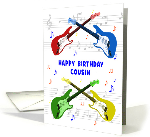 A beautiful birthday card for a cousin. Electric guitar colorful art with a music scale in the background. You cannot have too many guitars. A very cool guitar birthday card,celebrates the energy and sheer fun of this musical instrument. A perfect birthday card for guitarists and music lovers.