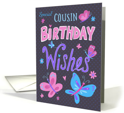 A Fun Girly Text and Butterfly illustrated Birthday Card design suitable for any age of Cousin. ©DaleSimpson