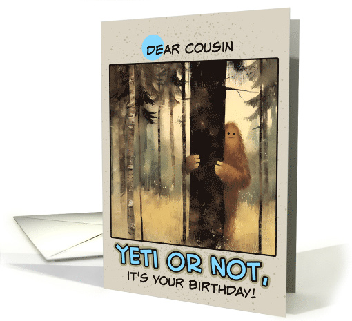 A famous creature of folklore, the elusive Bigfoot, has been sighted in the woods with the text 'Yeti or not, it's your birthday!' A whimsical Bigfoot birthday card with forest artwork to send to your wonderful cousin who's larger-than-life personality matches this sasquatch's towering fabled stature.