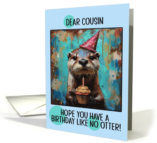 This delightful birthday card features a whimsical illustration of an adorable otter wearing a festive party hat and holding a delicious cupcake. The otter's fur is rendered with impressive detail, capturing its fuzzy texture and expressive eyes. The background is a vibrant, abstract swirl of blues, oranges, and browns, creating an underwater-like atmosphere filled with bubbles and splashes. The pun at the bottom, "Hope you have a birthday like no otter!" adds a playful, humorous touch that perfectly complements the charming otter illustration. A fun card to send to your wonderful cousin