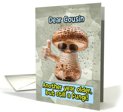 A fun mushroom with sunglasses gives the thumbs up on a olive green watercolor background with splatter effect and the text "Dear cousin another year older, but still a fungi!" in lime-green in a light-blue box. A fun card to send to your wonderful cousin for their birthday.
