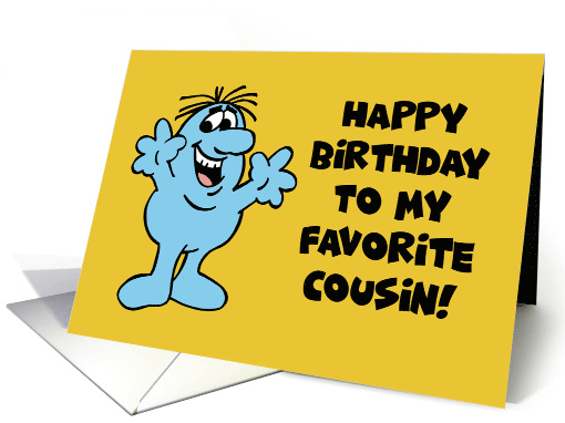 Funny Cousin Birthday card with a cartoon character on a yellow background. The words say: Happy Birthday to my favorite cousin! Inside says: Don't tell the others!