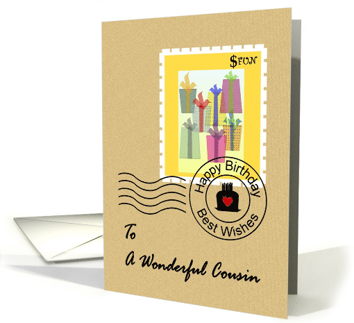 A birthday greeting for a cousin, featuring a stamp on an envelope. The stamp design shows lots of colorful presents within a bright yellow frame. The stamp value is $FUN. The franking stamp reads 'Happy Birthday' and 'Best Wishes', together with a birthday cake icon with a red heart.
