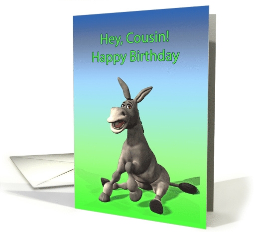 A funny birthday card for your cousin. An ass sits with a funny expression on his face. Inside the verse reads. "I knew a picture of a cute ass would make you smile!" Give your cousin a good laugh on his birthday.