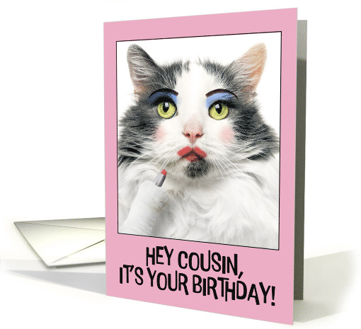 Happy Birthday Cousin Funny Cat Putting on Lots of Make Up