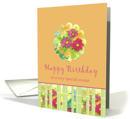 A colorful birthday card for a special cousin decorated with cheerful summer colors with asters painted with watercolor in a flower shape in the center on a tangerine orange background with a coordinating stripe design along the bottom.