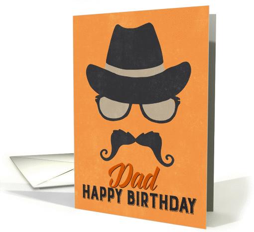 This is a fun hipster style Birthday card for dad featuring illustrated hat, glasses and curly mustache set against an orange textured background. The text beneath the illustration reads: Dad HAPPY BIRTHDAY. A minimalist but striking design. This design is also available in blue. © Natalie Kinnear Cards www.greetingcarduniverse.com/nataliekinnearcards