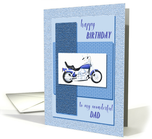 A blue motor cycle on an abstract blue background. The front says "Happy Birthday to my wonderful dad". A great card for a dad who is a motor bike enthusiast. The textures on the front of this card are printed.