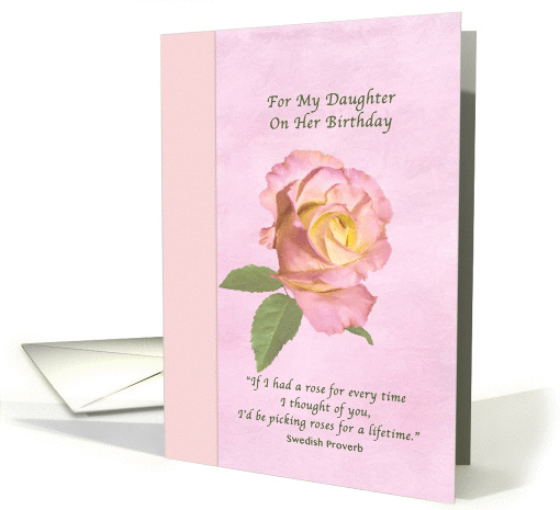 This birthday greeting for a daughter is a soft and dreamy floral design. A pink and yellow Peace Rose is shown on a background of muted pink. A wide vertical border in a pinkish yellow hue is on the left side of the image. A quote from an old Swedish proverb is under the rose. The background is a modified version of one by Karens Scraps and Graphics at Digital Scrap Designs.