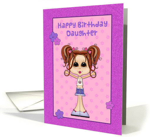 Send birthday wishes to a special teen Daughter with this cute and trendy girl with big doe eyes and pigtails on purple floral background with purple border with flowers. (Some graphics ©Trina Clark at digiwebstudio)