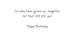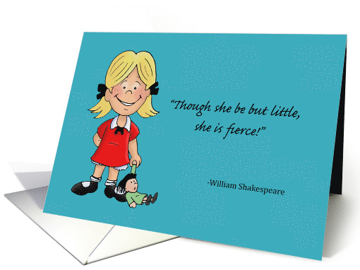 Humorous Birthday card for a daughter with a cartoon of a little girl with her doll. There is a quote from William Shakespeare, Though she be but little, she is fierce! Inside says, You may have grown up, but that still fits you! Happy Birthday