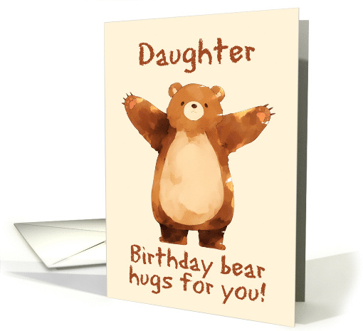 A sweet cartoon bear with it's arms spread wide for an incoming birthday bear hug on a beige background with the text "daughter birthday bear hugs for you!" A lovely card to send to your wonderful daughter for their special day.