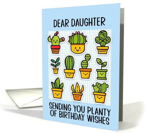 A whole bunch of kawaii cactus and succulent plants in pots on a light blue background with the text "dear daughter sending you planty of birthday wishes". A wonderful birthday card to send to your plant loving daughter