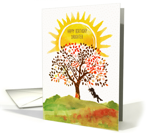 Give pretty and colorful happy birthday greetings to your young daughter with this design featuring a silhouette look of a young girl swinging on a tree swing being overlooked by a bright yellow watercolor effect sun. THE DESIGN HAS A WATERCOLOR LOOK, THIS IS A DIGITALLY CREATED EFFECT AND NOT REAL WATERCOLOR.