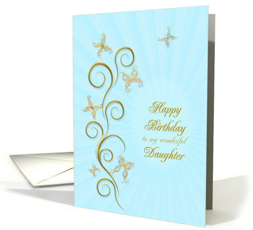 Golden butterflies made from delicate scroll work flutter around this elegant and beautiful birthday card for your daughter.