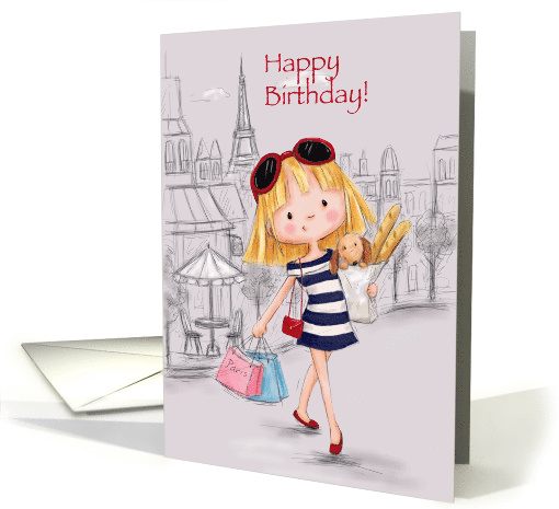 Cute young girl shopping with dog in Paris, Happy Birthday Daughter