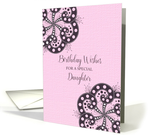 Fun pink Happy Birthday Wishes for a special Daughter with abstract symmetrical paisley flower design.