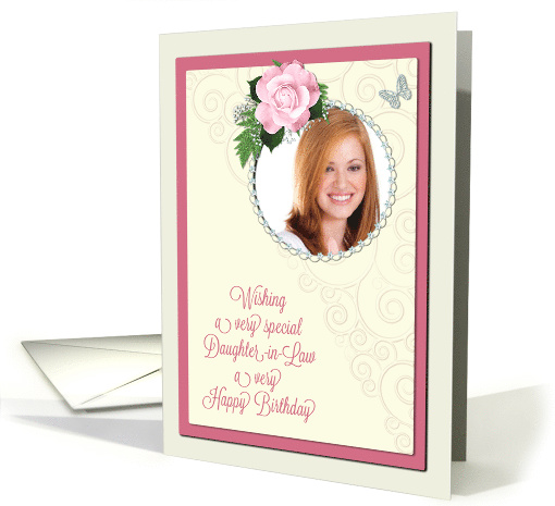 | Artist Notes: | Add your photo to personalize a unique and stunning birthday card for a daughter-in-law. Place your picture inside the diamond encrusted frame. a beautiful pink rose and jewelled butterfly completes the look. A very stylish and modern birthday card. All parts are printed. |