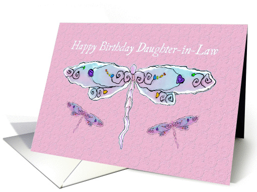 Fun,pretty design features three dragonflies coming to wish Happy Birthday Daughter-in-Law on a textured background,Original design by Betsy Bush of Birthday Cards Cafe'.