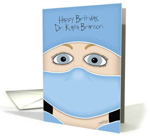 | Artist Notes: | ©Christie Black. The face of a blue eyed blond female is seen wearing typical medical or surgical attire including blue scrubs and hat and a face mask. Add any name to make this a personalized birthday card for a medical professional. |