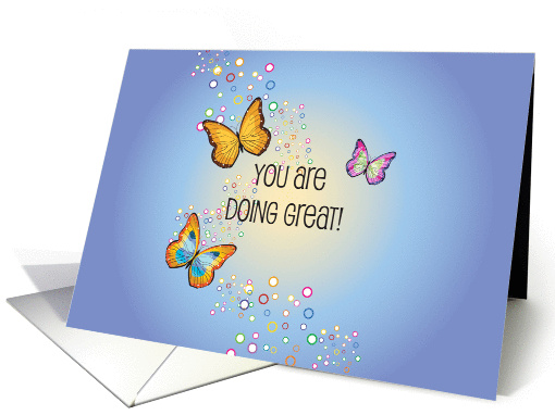 | Artist Notes: | This is an encouragement card with a butterfly theme, featuring my digital design of 3 colorful butterflies, bubbles, on a gradient blue background. You may change the inside message at check out, if you wish. |