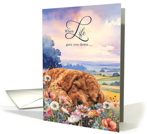 Pink and purple pastel hues creates a soft cloudy sky over gentle rolling hills on this card for the Spoodle lover in your life who could use some encouragement.