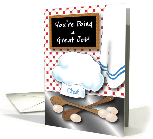 | Artist Notes: | This is an encouragement card for a chef/baker/cook, featuring my digital design of a chef's hat, dish towel, chalkboard, wooden spoons, and eggs on a stainless steel counter. You may change the inside message at check out, if you wish. |