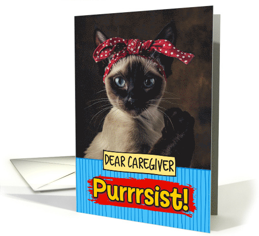 A cute Siamese Cat wearing a red and white polka-dotted bandana with her paws raised like the iconic WWII poster of Rosie the Riveter on a blue striped background with the text 'Dear Caregiver Purrrsist!' in yellow and red. A cute card to send to a fabulous caregiver who needs a bit of encouragement. You can do it!