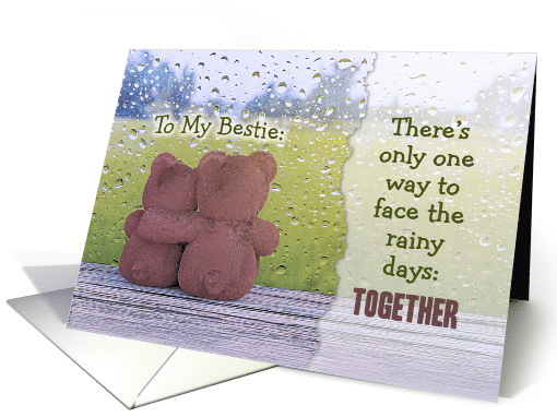 | Artist Notes: | Encourage your best friend, letting them know you're with them and you care with this unique card featuring the message, "To My Bestie: There's only one way to face the rainy days: TOGETHER." Background has two teddy bears embracing each other as they sit on a wooden table, looking out a rainy window. Inside can be customized with your own message. |
