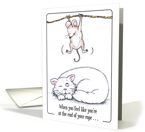 | Artist Notes: | Send this card to encourage a friend when they are down. It features a large mouse swinging from a rope about to fall on a white cat. 080611 |