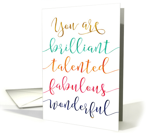 | Artist Notes: | Cheer a friend with colorful calligraphy compliments! Beautiful watercolor styled calligraphy design features this message: "You are Brilliant, Talented, Fabulous, Wonderful", in bright textured gold, turquoise, orange, pink, and blue on white background. Inside can be customized with your own unique message. |