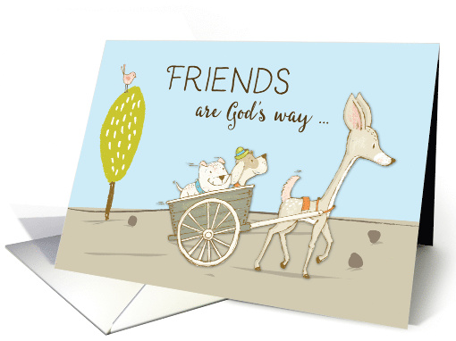 | Artist Notes: | Let your friend know you are thinking of them as you encourage them with this lightly religious card as they go through some bumps of life. A cute deer is pulling two dogs in a cart on a bumpy road. A bird is perched atop a tree. Sweet card to let your friend know you care. |