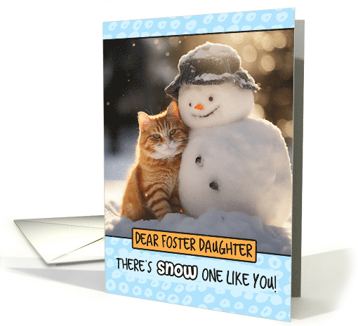 | Artist Notes: | A ginger cat poses with a sweet snowman in the snow on a sunny day on a light-blue background with a dot pattern and the text 'dear foster daughter there's snow one like you!' A cute and punny card to send to your foster child this winter season. |