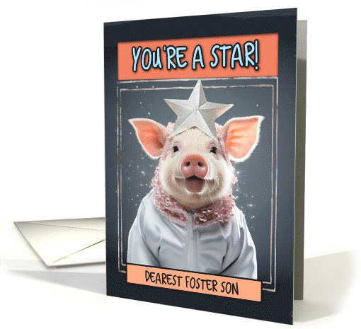 | Artist Notes: | A sweet piglet in a light blue jacket with pink trim is wearing a big star as a hat on a grey background with little silver stars and a silver-colored border with the text "You're a star!" in a salmon-pink colored box. A sweet encouragement card to send to your foster son to show your support. |