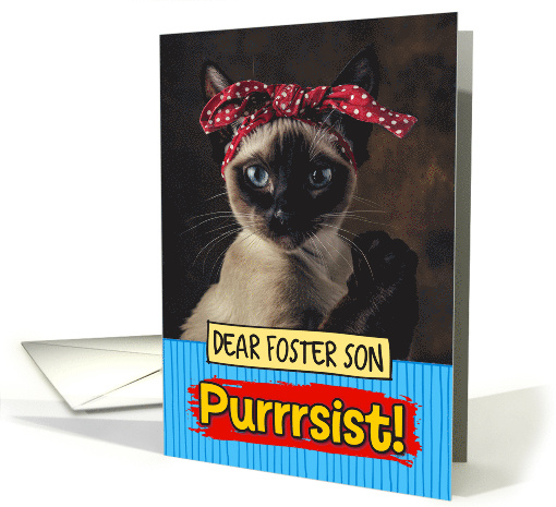 | Artist Notes: | A cute Siamese Cat wearing a red and white polka-dotted bandana with her paws raised like the iconic WWII poster of Rosie the Riveter on a blue striped background with the text 'Dear Foster Son Purrrsist!' in yellow and red. A cute card to send to your fabulous foster son who needs a bit of encouragement. You can do it! |