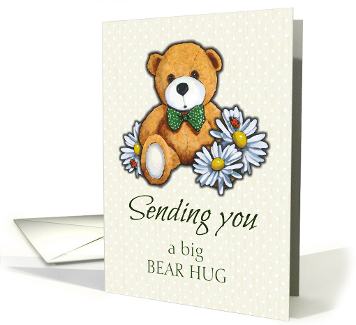 | Artist Notes: | The front of this card features my artwork of a cute teddy bear situated among daisies. Words below the image say "Sending you a big bear hug". There are words on the inside, but as always, you may customize the inside for your own purposes. |