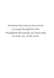 | Inside: | Just know that you can lean on me as you go through this trial. Throughout this journey you must walk, I'm with you, all the while. |
