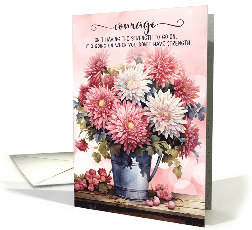 Wonderful card to offer encouragement to someone struggling in life. A gorgeous bucket of pink and white Chrysanthemums pair with a message of courage and strength.