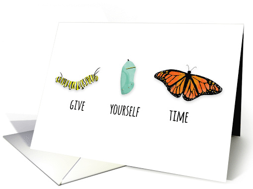 | Artist Notes: | Simple and elegant card features an inspirational quote, "Give yourself time", along with beautiful illustrations of a monarch butterfly in it's three stages of development. Inside is left blank for your own sentiment. |