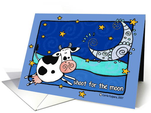 A cute cartoon cow is aiming for the moon on a blue background with stars and the text "Shoot for the Moon". A fun encouragement card to send to that certain someone who is ambitous in life and work.