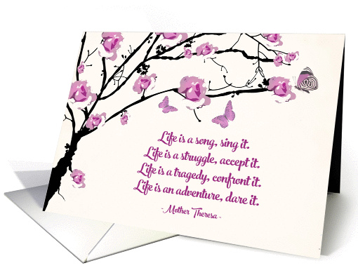 | Artist Notes: | This inspirational encouragement card features a quote by Mother Theresa about hanging on when life is difficult. A tree filled with Roses, and butterflies flitting about. |