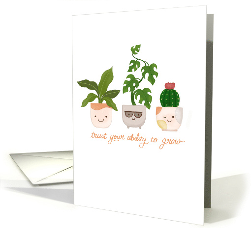 | Artist Notes: | A trio of whimsical plants in a row with a variety of foliage sprouting from their happy faced containers. Written beneath the illustration in peach hand lettering are the words "trust your ability to grow". A cheery way to send encouragement to the plant lover in your life. |