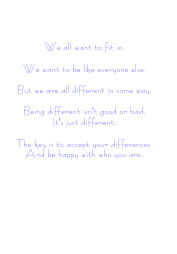 | Inside: | We all want to fit in. We want to be like everyone else. But we are all different in some way. Being different isn't good or bad. It's just different. The key is to accept your differences. And be happy with who you are. |
